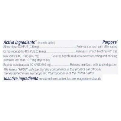 INGREDIENTS: In Each Tablet (C, K, CK, and X are homeopathic dilutions: See BoironUSA.com/info for details): Active Ingredients: *Abies Nigra 4C HPUS (0.6 mg), Relieves Stomach Pain After Eating (Claims based on traditional homeopathic practice, not accepted medical evidence. Not FDA evaluated); *Nux Vomica 4C HPUS (Contains Less than 10 to the Power of -9 mg Strychnine) (0.6 mg), Relieves Heartburn Due to Excessive Eating and Drinking (Claims based on traditional homeopathic practice, not accepted medical evidence. Not FDA evaluated); *Nux Vomica 4C HPUS (Contains Less than 10 to the Power of -9 mg Strychnine) (0.6 mg), Relieves Heartburn Due to Excessive Eating and Drinking (Claims based on traditional homeopathic practice, not accepted medical evidence. Not FDA evaluated); *Robinia Pseudoacacia 4C HPUS (0.6 mg), Relieves Heartburn with Acid Indigestion (Claims based on traditional homeopathic practice, not accepted medical evidence. Not FDA evaluated). Inactive Ingredients: Croscarmellose Sodium, Lactose, Magnesium Stearate. *The letter 'HPUS' indicate that the components in this product are officially monographed in the Homeopathic Pharmacopoeia of the United States.