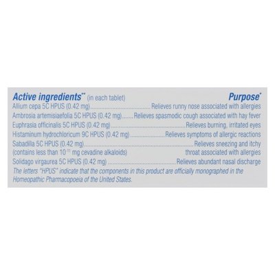 INGREDIENTS: In Each Tablet Active Ingredients: *Allium Cepa 5C HPUS (0.42 mg), Relieves Runny Nose Associated with Allergies; *Ambrosia Artemisiaefolia 5C HPUS (0.42 mg), Relieves Spasmodic Cough Associated with Hay Fever; *Euphrasia Officinalis 5C HPUS (0.42 mg), Relieves Burning, Irritated Eyes; *Histaminum Hydrochloricum 9C HPUS (0.42 mg), Relieves Symptoms of Allergic Reactions; *Sabadilla 5C HPUS (Contains less than 10 to the Power of 11 mg cevadine alkaloids) (0.42 mg), Relieves Sneezing and Itchy Throat Associated with Allergies; *Solidago Virgaurea 5C HPUS (0.42 mg), Relieves Abundant Nasal Discharge. Inactive Ingredients: Croscarmellose Sodium, Lactose, Magnesium Stearate. The letter 'HPUS' indicate that the components in this product are officially monographed in the Homeopathic Pharmacopoeia of the United States. *Claims Based on Traditional Homeopathic Practice, Not Accepted Medical Evidence. Not FDA Evaluated **C, K, CK, and X are homeopathic dilutions: see BoironUSA.com/info for details.