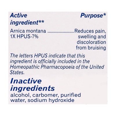 INGREDIENTS: Active Ingredients: **Arnica Montana 1x HPUS (7 %), Reduces Pain, Swelling, and Discoloration from Bruises. Inactive Ingredients: Alcohol, Carbomer, Purified Water, Sodium Hydroxide. The letters HPUS indicate that the component in this product is officially monographed in the Homeopathic Pharmacopoeia of the United States. *Claims based on traditional homeopathic practice, not accepted medical evidence. **C, K, CK, and X are homeopathic dilutions: see BoironUSA.com/info for details.