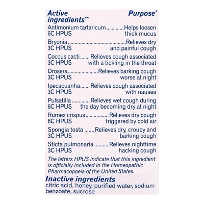 INGREDIENTS: Active Ingredients: Antimonium Tartaricum 6C HPUS (Contains Less than 10 to the Negative 11 Power = 0.00000000001 mg Antimony). (12.4 mg), Helps Loosen Thick Mucus; Bryonia 3C HPUS (12.4 mg), Relieves Dry and Painful Cough; Coccus Cacti 3C HPUS (12.4 mg), Relieves Cough Associated with a Tickling in the Throat; Drosera 3C HPUS (12.4 mg), Relieves Barking Cough Worse at Night; Ipecacuanha 3C HPUS (contains Less Than 10 to the Negative 6 Power = 0.000001 mg Emetine Alkaloids) (12.4 mg), Relieves Cough Associated with Nausea; Pulsatilla 6C HPUS (12.4 mg), Relieves Wet Cough During the Day Becoming Dry at Night; Rumex Crispus 6C HPUS (Contains Less Than 10 to the Negative 13 Power = 0.00000000000001 (12.4 mg), Relieves Dry Cough Triggered by Cold Air; Spongia Tosta 3C HPUS (12.4 mg), Relieves Dry, Croupy, and Barking Cough; Sticta Pulmonaria 3C HPUS (12.4 mg), Relieves Nighttime Hacking Cough. Inactive Ingredients: Alcohol, Citric Acid, Honey, Purified Water, Sodium, Benzoate, Sucrose. The letters HPUS indicate that the components in this product are officially monographed in the Homeopathic Pharmacopoeia of the United States. *Claims based on traditional homeopathic practice, not accepted medical evidence not FDA evaluated. **C, K, CK, and X are homeopathic dilutions: See BoironU?SA.com/info for details.