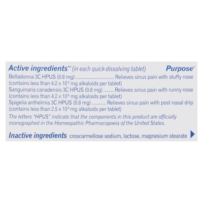 INGREDIENTS: Active ingredients (C, K, CK and X are homeopathic dilutions: see BoironUSA.com/info for details) (in each quick-dissolving tablet) Active Ingredients: Belladonna 3C HPUS (0.8 mg), Relieves sinus pain with stuffy nose (contains less than (4.2 x 10 to the power of -9 mg alkaloids per tablet); Sanguinaria Canadensis 3C HPUS (0.8 mg), Relieves sinus pain with runny nose (contains less than 4.2 x 10 to the power of -8 mg alkaloids per tablet); Spigelia Anthelmia 3C HPUS (0.8 mg), Relieves sinus pain with post nasal drip (contains less than 2.5 x 10 to the power of -8 mg alkaloids per tablet). Inactive Ingredients: Croscarmellose Sodium, Lactose, Magnesium Stearate.