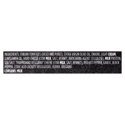 INGREDIENTS: Italian Tomatoes (Diced and Puree), Extra Virgin Olive Oil, Onions, Light Cream, Sunflower Oil, Hard Cheese (Cow Milk, Salt, Rennet, Anticaking Agent: Cellulose), Milk Protein, Sea Salt, Parmigiano Reggiano Cheese (Cow Milk, Salt, Rennet), Red Hot Pepper, Garlic, Black Pepper, Citric Acid (Acidity Regulator), Vodka, Oregano.