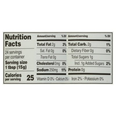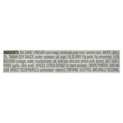 INGREDIENTS: Balsamic Vinegar (Wine Vinegar, Concentrated Grape Must, Caramel Color), Water, Canola Oil, Tamari Soy Sauce (Water, Soybeans, Salt, Sugar), Fig Slurry (Fig Paste, Fig Concentrate), Dijon Mustard (Vinegar, Water, Mustard Seed, Salt, White Wine, Citric Acid, Tartaric Acid, Spices), Salt, Garlic Puree (Garlic, Citric Acid), Spices, Citrus Extract (to Retard Spoilage), Onion Powder, Xanthan Gum, Mixed Tocopherols (Antioxidant – Vitamin E).