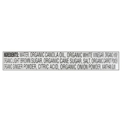 INGREDIENTS: Water, Organic Canola Oil, Organic White Vinegar, Organic Honey, Organic Light Brown Sugar, Organic Cane Sugar, Salt, Organic Carrot Powder, Organic Ginger Powder, Citric Acid, Organic Onion Powder, Xanthan Gum.