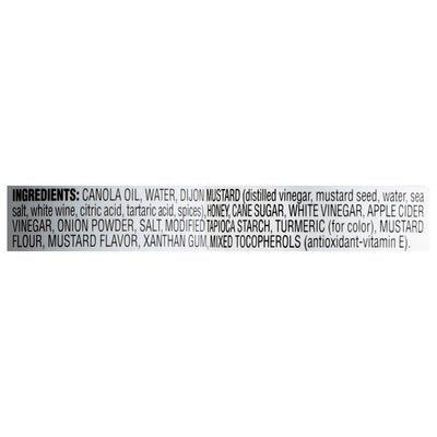 INGREDIENTS: Canola Oil, Water, Dijon Mustard (Distilled Vinegar, Mustard Seed, Water, Sea Salt, White Wine, Citric Acid, Tartaric Acid, Spices), Honey, Cane Sugar, White Vinegar, Apple Cider Vinegar, Onion Powder, Salt, Modified Tapioca Starch, Turmeric (for Color), Mustard Flour, Mustard Flour, Xanthan Gum, Mixed Tocopherols (Antioxidant-Vitamin E).