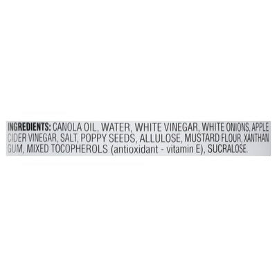 INGREDIENTS: Canola Oil, Water, White Vinegar, White Onions, Apple Cider Vinegar, Salt, Poppy Seeds, Allulose, Mustard Flour, Xanthan Gum, Mixed Tocopherols (Antioxidant - Vitamin E), Sucralose.