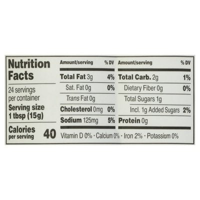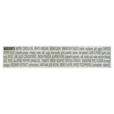 INGREDIENTS: Water, Canola Oil, White Vinegar, Brown Sugar, Tamari Soy Sauce (Water, Soybean, Salt, Sugar), Chipotle Pepper Sauce (Chipotle Pepper, Vinegar, Water, Salt, Sugar, Onion Powder, Garlic Powder, Spices, Red Pepper), Garlic Puree (Garlic, Citric Acid), Spices, Lime Juice Concentrate, Onion Powder, Jalapeno Puree (Jalapeno Peppers, Salt, Acetic Acid, Water, Calcium Chloride), Salt, Dried Jalapeno Pepper Granules, Tomato Powder, Modified Tapioca Starch, Tangerine Peel Flavor (to Retard Spoilage), Rosemary Extract (Antioxidant), Xanthan Gum, Natural Smoke Flavor, Mixed Tocopherol (Antioxidant - Vitamin E).