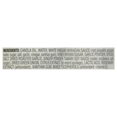 INGREDIENTS: Canola Oil, Water, White Vinegar, Sriracha Sauce (Red Jalapeno Pepper, Water, Sugar, Salt, Garlic, Vinegar, Xanthan Gum), Honey, Brown Sugar, Garlic Powder, Spices, Salt, Dried Roasted Garlic, Ginger Powder, Tamari Soy Sauce (Water, Soybeans, Salt, Sugar), Dried Green Onion, Citrus Extract (to Retard Spoilage), Lactic Acid, Rosemary Extract (Antioxidant), Xanthan Gum, Mixed Tocopherols (Antioxidant – Vitamin E).