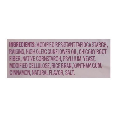 INGREDIENTS: Modified Resistant Tapioca Starch, Raisins, High Oleic Sunflower Oil, Chicory Root Fiber, Native Cornstarch, Psyllium, Yeast, Modified Cellulose, Rice Bran, Xanthan Gum, Cinnamon, Natural Flavor, Salt.