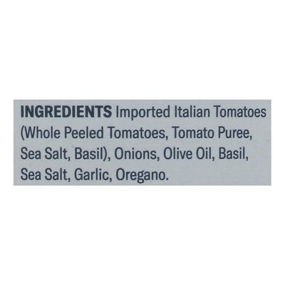 INGREDIENTS: Imported Italian Tomatoes (Whole Peeled Tomatoes, Tomato Puree, Sea Salt, Basil), Onions, Olive Oil, Basil, Sea Salt, Garlic, Oregano.