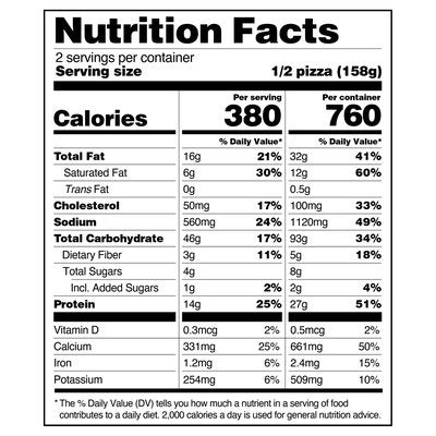 INGREDIENTS: Crust (Cauliflower, Brown Rice Flour, White Rice Flour, Water, Tapioca Starch, Cornstarch, Sunflower Oil, Egg, Extra Virgin Olive Oil, Baking Powder [Sodium Acid Pyrophosphate, Sodium Bicarbonate, Corn Starch, Monocalcium Phosphate], Xanthan Gum, Sugar, Yeast, Vinegar, Salt), Bechamel Sauce (Water, Seasoning [Dry Whole Milk, Modified Corn Starch, Salt, Garlic, Less than 2% Sugar, Yeast Extract, Natural Flavors, Spices, Onion, Dried Chives, Whey, Maltodextrin, Dehydrated Butter, Soybean Oil {Processing Aid}]), Low Moisture Part Skim Mozzarella Cheese (Pasteurized Part Skim Milk, Cheese Cultures, Salt, Enzymes), Spinach, Parmesan, Romano and Asiago Cheese Blend (Pasteurized Part Skim Cow's Milk, Cheese Cultures, Salt, Enzymes).