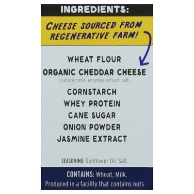 INGREDIENTS: Wheat Flour, Organic Cheddar Cheese (Cultured Milk, Enzymes Extract, Salt), Cornstarch, Whey Protein, Cane Sugar, Onion Powder, Jasmine Extract. Seasoning: Sunflower Oil, Salt.