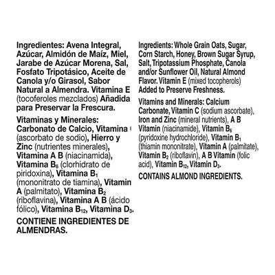 DESCRIPTION: Sweetened whole grain oat cereal with real honey & natural almond flavor. Naturally flavored. Per 1 Cup Serving: 140 calories; 0 g sat fat (0% DV); 210 mg sodium (9% DV); 12 g total sugars. Gluten free. 22 g whole grain per serving at least 48 g recommend daily. Good source of calcium. Good source of fiber. With 12 vitamins & minerals. See nutrition facts for as prepared information. Can help lower cholesterol (Three grams of soluble fiber daily from whole grain oat foods, like honey nut cheerios cereal, in a diet low in saturated fat and cholesterol, may reduce the risk of heart disease. Honey nut Cheerios cereal provides .75 grams per serving) as part of a heart healthy diet. Contains bioengineered food ingredients. Learn more at Ask.GeneralMills.com. A buzz-worthy choice! Real honey, a-maze-ing taste! Thanks to Buzz and his real honey goodness, you can get this day started right with deliciousness and nutritiousness. Now that's a good morning. Give yourself a high-five! Or maybe just another bowl. This package is sold by weight, not by volume. You can be assured of proper weight even though some settling of contents normally occurs during shipment and handling. generalmills.com. how2recycle.info. Ask.GeneralMills.com. We welcome your questions and comments: generalmills.com. 1-800-328-1144. Proud sponsor of Celiac Disease Foundation. celiac.org. Box Tops for Education: Download the app. Scan your receipt. Earn cash for schools. Certified 100% recycled paperboard. < Whole Grain Oats, Sugar, Corn Starch, Honey, Brown Sugar Syrup, Salt, Tripotassium Phosphate, Canola and/or Sunflower Oil, Natural Almond Flavor, Vitamin E (Mixed Tocopherols) Added to Preserve Freshness. Vitamins and Minerals: Calcium Carbonate, Vitamin C (Sodium Ascorbate), Iron and Zinc (Mineral Nutrients), A B Vitamin (Niacinamide), Vitamin B (Pyridoxine Hydrochloride), Vitamin B, (Thiamin Mononitrate), Vitamin A (Palmitate), Vitamin B2 (Riboflavin), a B Vitamin (Folic Acid), Vitamin B12, Vitamin D3.
