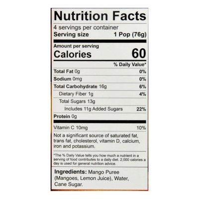 INGREDIENTS: Mango Puree (Mangoes, Lemon Juice), Water, Cane Sugar.
