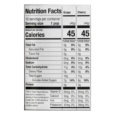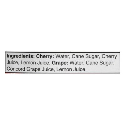 INGREDIENTS: Cherry: Water, Cane Sugar, Cherry Juice, Lemon Juice, Grape: Water, Cane Sugar, Concord Grape Juice, Lemon Juice.