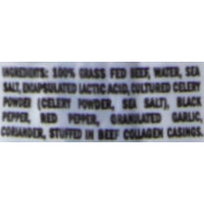 INGREDIENTS: 100% Grass Fed Beef, Water, Sea Salt, Dicapsulated Lactic Acid, Cultured Celery Powder (Celery Powder, Sea Salt), Black Pepper, Red Pepper, Granulated Garlic, Coriander, Stuffed in Beef Collagen Casings.