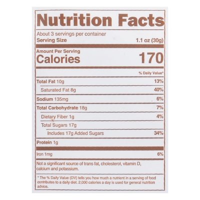 INGREDIENTS: Organic Cane Sugar, Oatmilk Chocolate (Cane Sugar, Chocolate Liquor, Cacao Butter, Oat Powder, Rice Syrup Solids, Sunflower Lecithin (Emulsifier), Vanilla), Organic Coconut Oil, Organic Coconut Cream (Organic Coconut Extract, Water), Caster Sugar, Organic Vanilla Extract, Sea Salt.