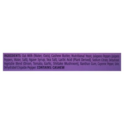 INGREDIENTS: Oat Milk (Water, Oats), Cashew Butter, Nutritional Yeast, Jalapeno Peppers (Jalapeno Peppers, Water, Salt), Agave Syrup, Sea Salt, Lactic Acid (Plant Derived), Sodium Citrate, Dehydrated Vegetable Blend (Onion, Tomato, Garlic, Shiitake Mushroom), Xanthan Gum, Cayenne Pepper, Spice, Dehydrated Chipotle Pepper.