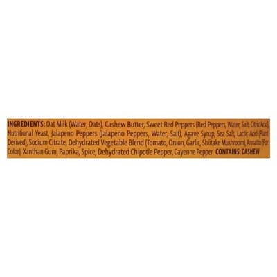INGREDIENTS: Oat Milk (Water, Oats), Cashew Butter, Sweet Red Peppers (Red Peppers, Water, Salt, Citric Acid), Nutritional Yeast, Jalapeno Peppers (Jalapeno Peppers, Water, Salt), Agave Syrup, Sea Salt, Lactic Acid (Plant Derived), Sodium Citrate, Dehydrated Vegetable Blend (Tomato, Onion, Garlic, Shiitake Mushroom), Annatto (for Color), Xanthan Gum, Paprika, Spice, Dehydrated Chipotle Pepper, Cayenne Pepper.