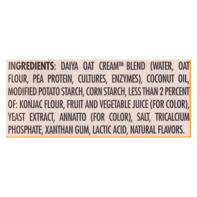 INGREDIENTS: Daiya Oat Cream Blend (Water, Oat Flour, Pea Protein, Cultures, Enzymes), Coconut Oil, Modified Potato Starch, Corn Starch, Less than 2 Percent of: Konjac Flour, Fruit and Vegetable Juice (for Color), Yeast Extract, Annatto (for Color), Salt, Tricalcium Phosphate, Xanthan Gum, Lactic Acid, Natural Flavors.