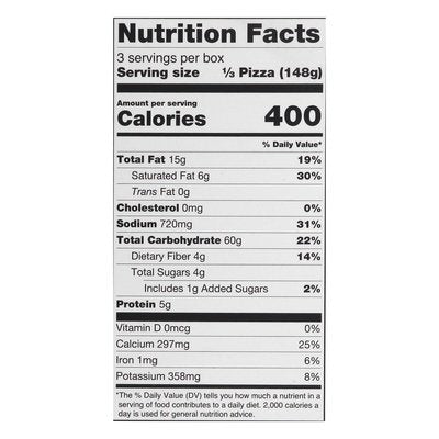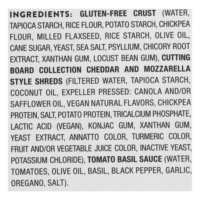 INGREDIENTS: Gluten-Free Crust (Water, Tapioca Starch, Rice Flour, Potato Starch, Chickpea Flour, Milled Flaxseed, Rice Starch, Olive Oil, Cane Sugar, Yeast, Sea Salt, Psyllium, Chicory Root Extract, Xanthan Gum, Locust Bean Gum), Cutting Board Collection Cheddar and Mozzarella Style Shreds (Filtered Water, Tapioca Starch, Coconut Oil, Expeller Pressed: Canola and/or Safflower Oil, Vegan Natural Flavors, Chickpea Protein, Salt, Potato Protein, Tricalcium Phosphate, Lactic Acid (Vegan), Konjac Gum, Xanthan Gum, Yeast Extract, Annatto Color, Turmeric Color, Fruit and/or Vegetable Juice Color, Inactive Yeast, Potassium Chloride), Tomato Basil Sauce (Water, Tomatoes, Olive Oil, Basil, Black Pepper, Garlic, Oregano, Salt).