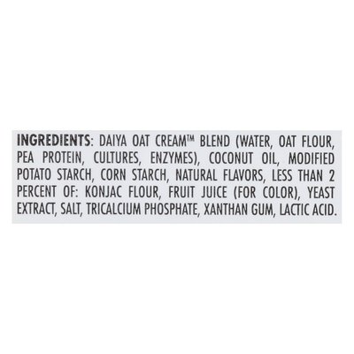 INGREDIENTS: Daiya Oat Cream Blend (Water, Oat Flour, Pea Protein, Cultures, Enzymes), Coconut Oil, Modified Potato Starch, Corn Starch, Natural Flavors, Less than 2 Percent of: Konjac Flour, Fruit Juice (for Color), Yeast Extract, Salt, Tricalcium Phosphate, Xanthan Gum, Lactic Acid.