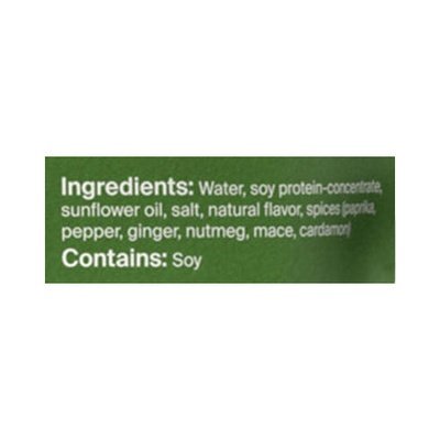 INGREDIENTS: Water, Soy Protein-Concentrate, Sunflower Oil, Salt, Natural Flavor, Spices (Paprika, Pepper, Ginger, Nutmeg, Mace, Cardamom).