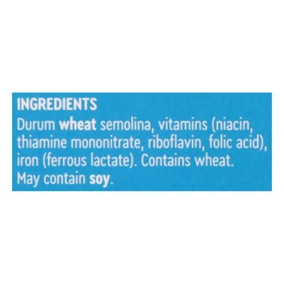 INGREDIENTS: Durum Wheat Semolina, Vitamins (Niacin, Thiamine Mononitrate, Riboflavin, Folic Acid), Iron (Ferrous Lactate).