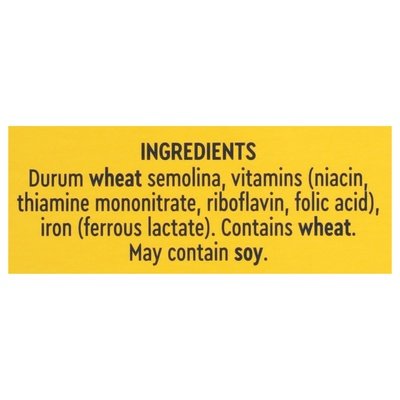 INGREDIENTS: Durum Wheat Semolina, Vitamins (Niacin, Thiamine Mononitrate, Riboflavin, Folic Acid), Iron (Ferrous Lactate).