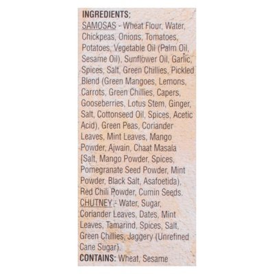 INGREDIENTS: Samosas - Wheat Flour, Water, Chickpeas, Onions, Tomatoes, Potatoes, Vegetable Oil (Palm Oil, Sesame Oil), Sunflower Oil, Garlic, Spices, Salt, Green Chillies, Pickled Blend (Green Mangoes, Lemons, Carrots, Green Chillies, Capers, Gooseberries, Lotus Stem, Ginger, Salt, Cottonseed Oil, Spices, Acetic Acid), Green Peas, Coriander Leaves, Mint Leaves, Mango Powder, Ajwain, Chaat Masala (Salt, Mango Powder, Spices, Pomegranate Seed Powder, Mint Powder, Black Salt, Asafoetida), Red Chili Powder, Cumin Seeds. Chutney: Water, Sugar, Coriander Leaves, Dates, Mint Leaves, Tamarind, Spices, Salt, Green Chillies, Jaggery (Unrefined Cane Sugar).