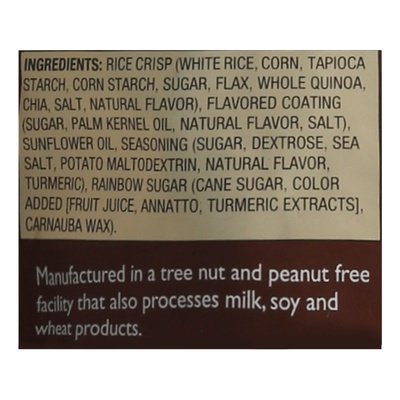 INGREDIENTS: Rie Crisp (White Rice, Corn, Tapioca Starch, Corn Starch, Sugar, Flax, Whole Quinoa, Chia, Salt, Natural Flavor), Flavored Coating (Sugar, Palm Kernel Oil, Natural Flavor, Salt), Sunflower Oil, Seasoning (Sugar, Dextrose, Sea Salt, Potato Maltodextrin, Natural Flavor, Turmeric), Rainbow Sugar (Cane Sugar, Color Added [Fruit juice, Annatto, Turmeric Extracts], Carnauba Wax).