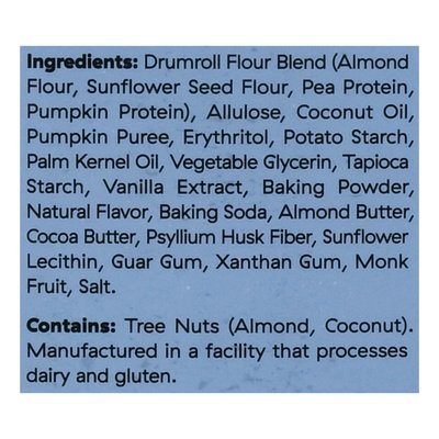 INGREDIENTS: Drumroll Flour Blend (Almond Flour, Sunflower Seed Flour, Pea Protein, Pumpkin Protein), Allulose, Coconut Oil, Pumpkin Pure, Erythritol, Potato Starch, Palm Kernel Oil, Vegetable Glycerin, Tapioca Starch, Vanilla Extract, Baking Powder, Natural Flavor, Baking Soda, Almond Butter, Cocoa Butter, Psyllium Husk Fiber, Sunflower Lecithin, Guar Gum, Xanthan Gum, Monk Fruit, Salt.