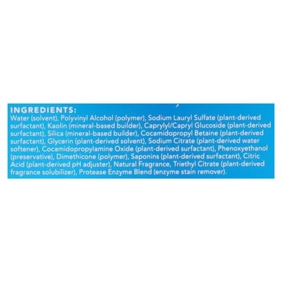 INGREDIENTS: Water (Solvent), Polyvinyl Alcohol (Polymer), Sodium Lauryl Sulfate (Plant-Derived Surfactant), Kaolin (Mineral-Based Builder), Caprylyl/Capryl Glucoside (Plant-Derived Surfactant), Silica (Mineral-Based Builder), Cocamidopropyl Betaine (Plant-Derived Surfactant), Glycerin (Plant-Derived Solvent), Sodium Citrate (Plant-Derived Water Softener), Cocamidopropylamine Oxide (Plant-Derived Surfactant), Phenoxyethanol (Preservative), Dimethicone (Polymer), Saponins (Plant-Derived Surfactant), Citric Acid (Plant-Derived pH Adjuster), Natural Fragrance, Triethyl Citrate (Plant-Derived Fragrance Solubilizer), Protease Enzyme Blend (Enzyme Stain Remover).