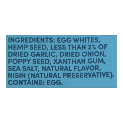 INGREDIENTS: Egg Whites, Hemp Seed, Less than 2% of Dried Garlic, Dried Onion, Poppy Seed, Xanthan Gum, Sea Salt, Natural Flavor, Nisin (Natural Preservative).