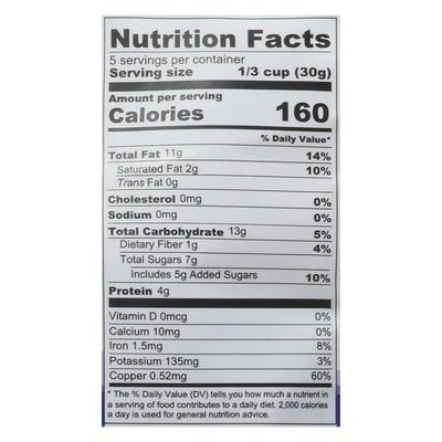 PRODUCT DETAILS: Provides 1.5 mg iron. High in copper. Provides 1 g fiber. USDA Organic. Eco Cert: Cosmos Organic. Gluten free: Beyond Celiac Gluten-free. Gluten-free certification program. www.gf-cert.org. Certified organic by Ecocert Canada - 91344. Elan organic acai blueberry cashews combine lightly roasted cashews with tangy blueberry and acai powder. The acai berry comes from the acai berry palm tree, which is native to the tropical rainforests of South America. The tart flavor of acai berries and the sweetness of blueberries create a perfect fruity coating for roasted cashews. Try acai blueberry cashews in healthy smoothies or enjoy them by the handful as a delicious snack. For a twist, add them to summer salads or in your favorite cashew cookie recipe! Deliciously good for you. elanbio.com. Prepared in Canada from imported ingredients.