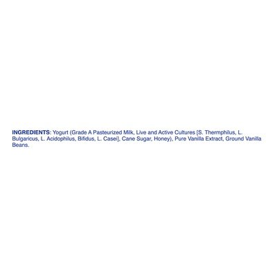 INGREDIENTS: Yogurt (Grade A Pasteurized Milk, Live and Active Cultures [S. Thermophilus, L. Bulgaricus, L. Acidophilus, Bifidus, L. Casei], Cane Sugar, Honey), Pure Vanilla Extract, Ground Vanilla Beans.