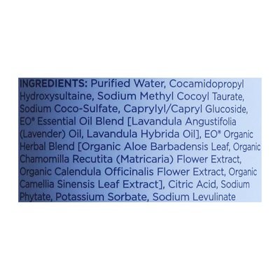 INGREDIENTS: Purified Water, Cocamidopropyl Hydroxysultaine, Sodium Methyl Cocoyl Taurate, Sodium Coco-Sulfate, Caprylyl/Capryl Glucoside, EO Essential Oil Blend [Lavandula Angustifolia (Lavender) Oil, Lavandula Hybrida Oil], EO Organic Herbal Blend [Organic Aloe Barbadensis Leaf, Organic Chamomilla Recutita (Matricaria) Flower Extract, Organic Calendula Officinalis Flower Extract, Organic Camellia Sinensis Leaf Extract], Citric Acid, Sodium Phytate, Potassium Sorbate, Sodium Levulinate.