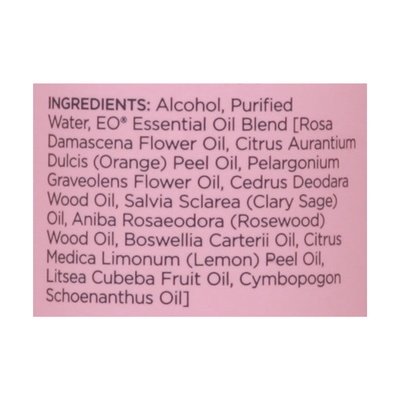 INGREDIENTS: Alcohol, Purified Water, EO Essential Oil Blend [Rosa Damascena Flower Oil, Citrus Aurantium Dulcis (Orange) Peel Oil, Pelargonium Graveolens Flower Oil, Cedrus Deodara Wood Oil, Salvia Sclarea (Clary Sage) Oil, Aniba Rosaeodora (Rosewood) Wood Oil, Boswellia Carterii Oil, Citrus Medica Limonum (Lemon) Peel Oil, Litsea Cubeba Fruit Oil, Cymbopogon Schoenanthus Oil].