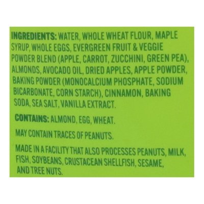 INGREDIENTS: Water, Whole Wheat Flour, Maple Syrup, Whole Eggs, Evergreen Fruit & Veggie Powder Blend (Apple, Carrot, Zucchini, Green Pea), Almonds, Avocado Oil, Dried Apples, Apple Powder, Baking Powder (Monocalcium Phosphate, Sodium Bicarbonate, Corn Starch), Cinnamon, Baking Soda, Sea Salt, Vanilla Extract.