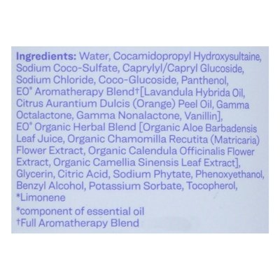 INGREDIENTS: Water, Cocamidopropyl Hydroxysultaine, Sodium Coco-Sulfate, Caprylyl/Capryl Glucoside, Sodium Chloride, Coco-Glucoside, Panthenol, Eo (Component of Essential Oil) Aromatherapy Blend (Full Aromatherapy Blend Available at www.Eoproducts.com) [Lavandula Hybrida Oil, Citrus Aurantium Dulcis (Orange) Peel Oil, Gamma Octalactone, Gamma Nonalactone, Vanillin] Eo(Component of Essential Oil) Organic Herbal Blend [Organic Aloe Barbadensis Leaf Juice, Organic Chamomilla Recutita (Matricaria) Flower Extract, Organic Calendula Officinalis Flower Extract, Organic Camellia Sinensis Leaf Extract] Glycerin, Citric Acid, Sodium Phytate, Phenoxyethanol, Benzyl Alcohol, Potassium Sorbate, Tocopherol, (Component of Essential Oil) Limonene.