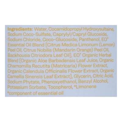 INGREDIENTS: Water, Cocamidopropyl Hydroxysultaine, Sodium Coco-Sulfate, Caprylyl/Capryl Glucoside, Sodium Chloride, Coco-Glucoside, Panthenol, EO Essential Oil Blend [Citrus Medica Limonum (Lemon) Peel Oil, Citrus Nobilis (Mandarin Orange) Peel Oil, Backhousia Citriodora Leaf Oil], EO Organic Herbal Blend [Organic Aloe Barbadensis Leaf Juice, Organic Chamomilla Recutita (Matricaria) Flower Extract, Organic Calendula Officinalis Flower Extract, Organic Camellia Sinensis Leaf Extract], Glycerin, Citric Acid, Sodium Phytate, Phenoxyethanol, Benzyl Alcohol, Potassium Sorbate, Tocopherol, (Component of Essential Oil) Limonene.