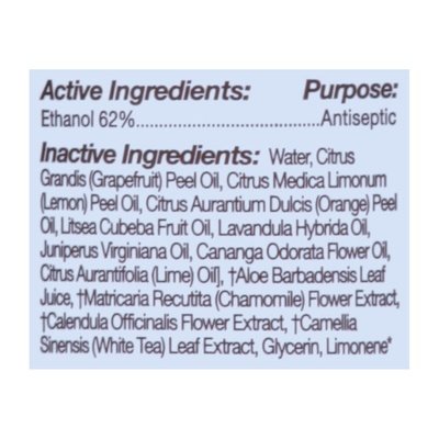 INGREDIENTS: Active Ingredients: Ethanol (62 %), Antiseptic. Inactive Ingredients: Water, Citrus Grandis (Grapefruit) Peel Oil, Citrus Medica Limonum (Lemon) Peel Oil, Citrus Aurantium Dulcis (Orange) Peel Oil, Litsea Cubeba Fruit Oil, Lavandula Hybrida Oil, Juniperus Virginiana Oil, Cananga Odorata Flower Oil, Citrus Aurantifolia (Lime) Oil, (Organic) Aloe Barbadensis Leaf Juice, (Organic) Matricaria Recutita (Chamomile) Flower Extract, (Organic) Calendula Officinalis Flower Extract, (Organic) Camellia Sinensis (White Tea) Leaf Extract, Glycerin, Limonene (Component of Essential Oil) .