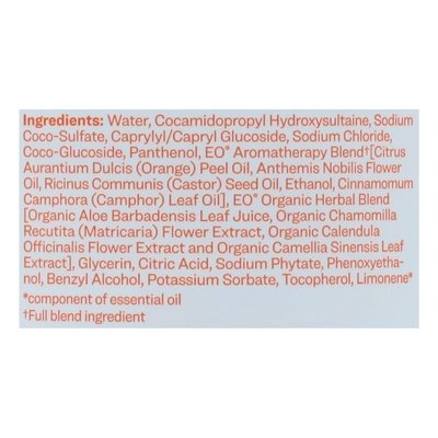 INGREDIENTS: Water, Cocamidopropyl Hydroxysultaine, Sodium Coco-Sulfate, Caprylyl/Capryl Glucoside, Sodium Chloride, Coco-Glucoside, Panthenol, Eo Aromatherapy Blend (Full Blend Ingredient List Available at Www,Eoproducts,Corn)[Citrus Aurantium Dulcis (Orange) Peel Oil, Anthemis Nobilis Flower Oil, Ricinus Communis (Castor) Seed Oil, Ethanol, Cinnamomum Camphora (Camphor) Leaf Oil], Eo Organic Herbal Blend [Organic Aloe Barbadensis Leaf Juice, Organic Chamomilla Recutita (Matricaria) Flower Extract, Organic Calendula Officinalis Flower Extract and Organic Camellia Sinensis Leaf Extract], Glycerin, Citric Acid, Sodium Phytate, Phenoxyethanol, Benzyl Alcohol, Potassium Sorbate, Tocopherol, Limonene (Component of Essential Oil).
