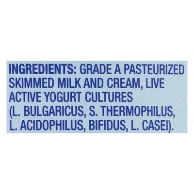 INGREDIENTS: Grade A Pasteurized Skimmed Milk and Cream, Live Active Yogurt Cultures (L. Bulgaricus, S. Thermophilus, L. Acidophilus, Bifidus, L. Casei).