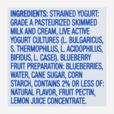 INGREDIENTS: Strained Yogurt: Grade A Pasteurized Skimmed Milk and Cream, Live Active Yogurt Cultures (L. Bulgaricus, S. Thermophilus, L. Acidophilus, Bifidus, L. Casei). Blueberry Fruit Preparation: Blueberries, Water, Cane Sugar, Corn Starch, Contains 2% or Less of: Natural Flavor, Fruit Pectin, Lemon Juice Concentrate.