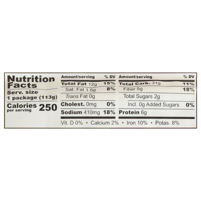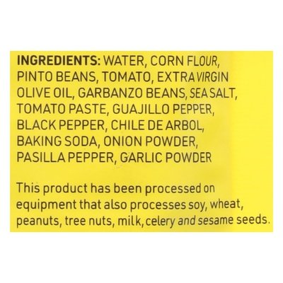 INGREDIENTS: Water, Corn Flour, Pinto Beans, Tomato, Extra Virgin Olive Oil, Garbanzo Beans, Sea Salt, Tomato Paste, Guajillo Pepper, Black Pepper, Chile De Arbol, Baking Soda, Onion Powder, Pasilla Pepper, Garlic Powder.