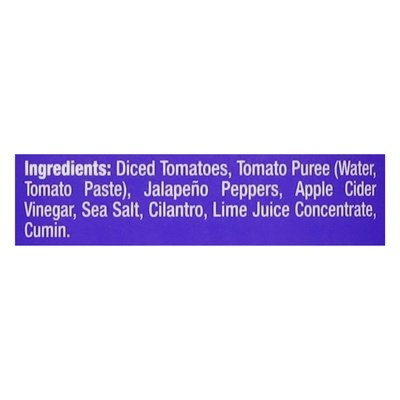 INGREDIENTS:  Diced Tomatoes, Tomato Puree (Water, Tomato Paste), Jalapeno Peppers, Apple Cider Vinegar, Sea Salt, Cilantro, Lime Juice Concentrate, Cumin.