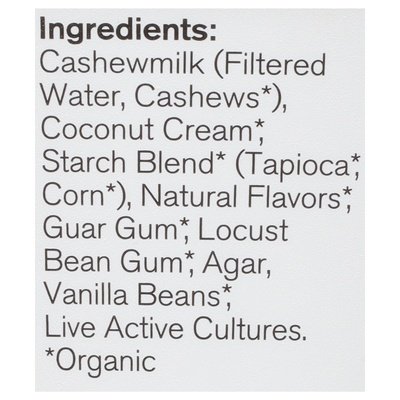 INGREDIENTS: Cashewmilk (Filtered Water, Cashews (Organic)), Coconut Cream (Organic), Starch Blend (Organic) (Tapioca (Organic), Corn (Organic)), Natural Flavors (Organic), Guar Gum (Organic), Locust Bean Gum (Organic), Agar, Vanilla Beans (Organic), Live Active Cultures. Live Active Cultures: S. Thermophilus, L. Bulgaricus, L. Acidophilus, Bifidus, L. Lactis, L. Plantarum.