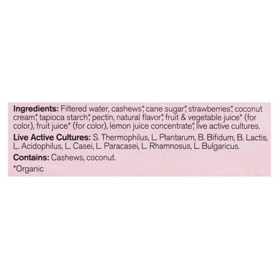 INGREDIENTS: Filtered Water, Cashews (Organic), Cane Sugar (Organic), Strawberries (Organic), Coconut Cream (Organic), Tapioca Starch (Organic), Pectin, Natural Flavor (Organic), Fruit & Vegetable Juice (Organic) (for Color), Fruit Juice (Organic) (for Color), Lemon Juice Concentrate (Organic), Live Active Cultures, Live Active Cultures: S. Thermophilus, L, Plantarum, B, Bifidum, B, Lactis, L. Acidophilus, L. Casei, L, Paracasei, L, Rhamnosus, L. Bulgaricus.
