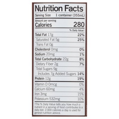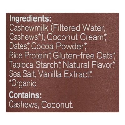 INGREDIENTS: Cashewmilk (Filtered Water, Cashews (Organic)), Coconut Cream (Organic), Dates (Organic), Cocoa Powder (Organic), Rice Protein (Organic), Gluten-Free Oats (Organic), Tapioca Starch (Organic), Natural Flavor (Organic), Sea Salt, Vanilla Extract (Organic).